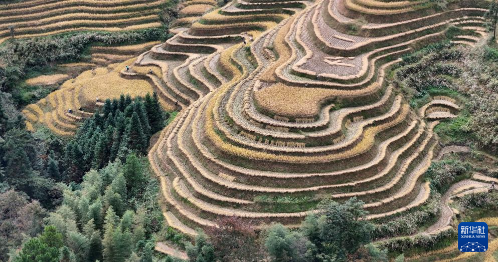 在廣西桂林市龍勝各族自治縣龍脊鎮大寨村,村民在收割水稻(10月30日攝,無人機照片)。