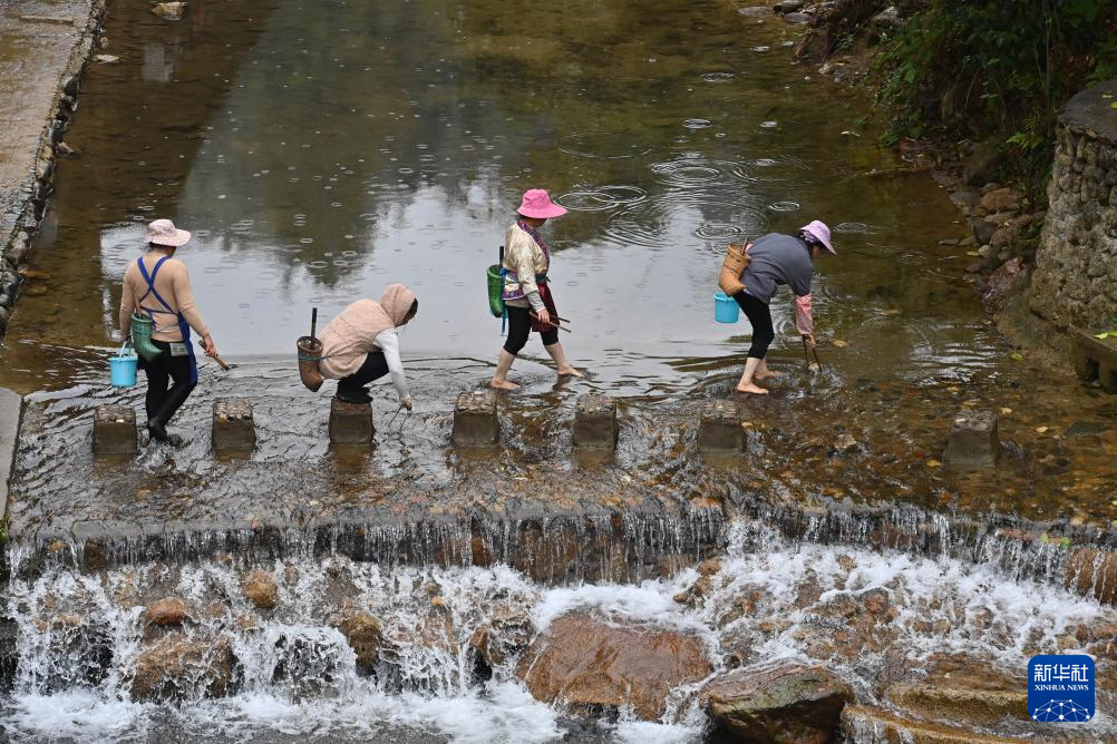 烏英苗寨的婦女們在冒雨清理烏嘎河的垃圾(2022年11月19日攝)。