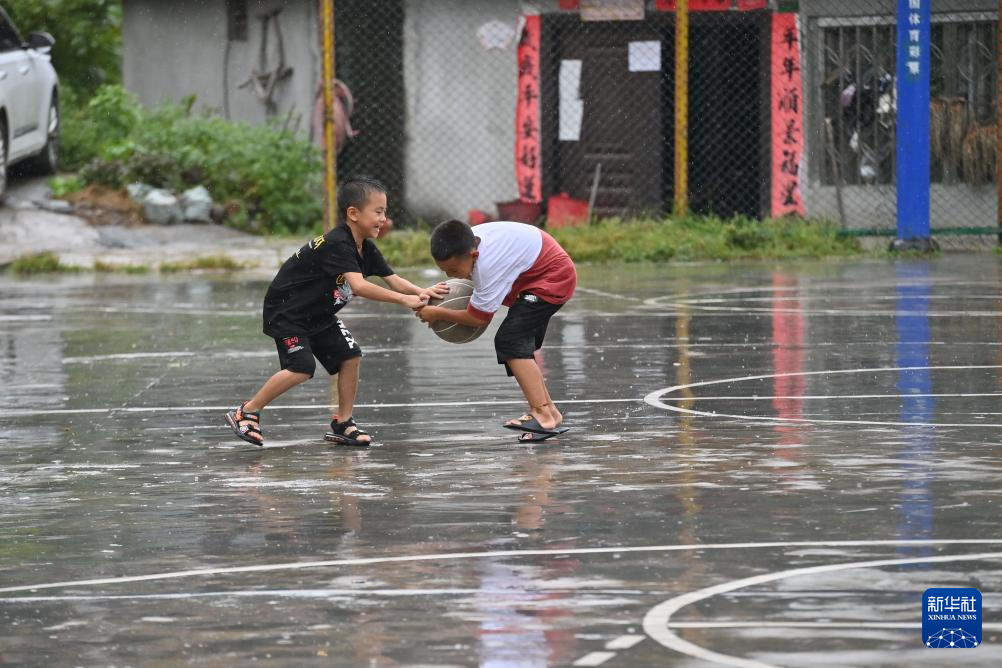烏英苗寨的孩子們在雨中打籃球(2023年8月2日攝)。