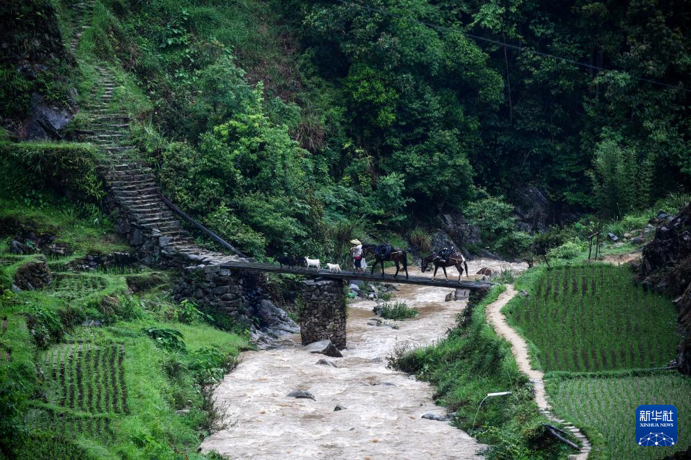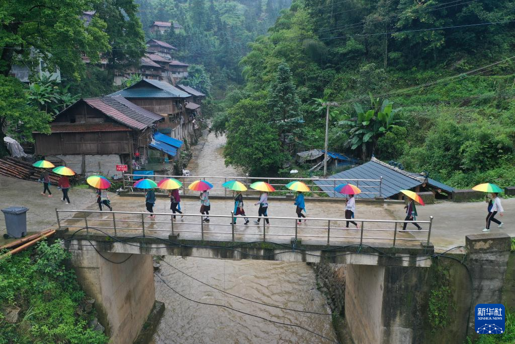 在烏英苗寨,婦女們冒雨去參加集體勞動(2019年7月6日攝)。