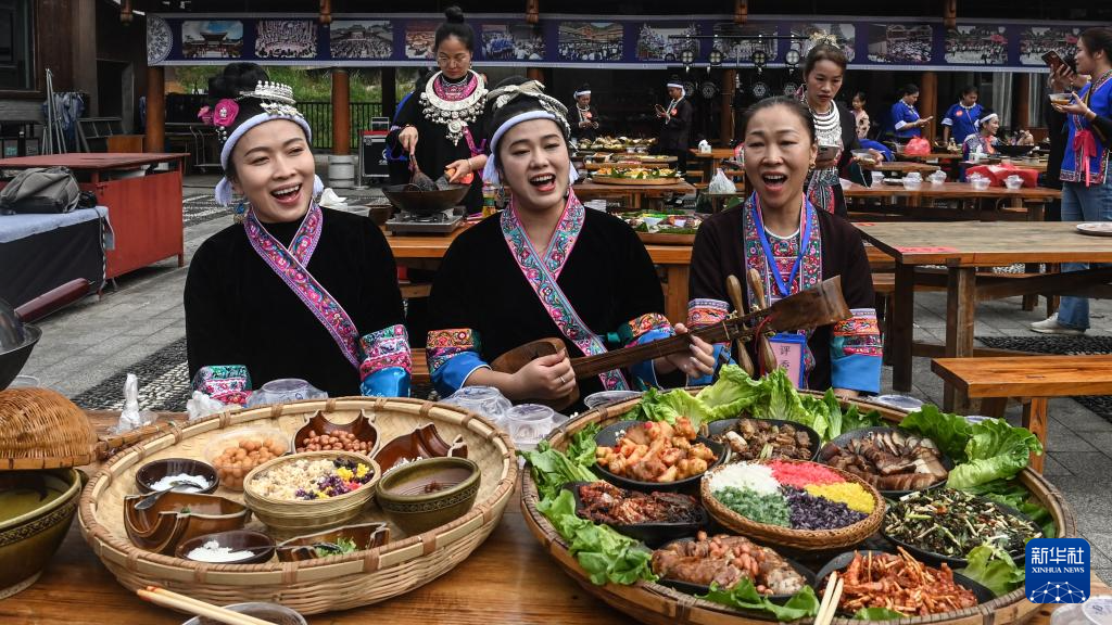 11月9日,在廣西三江侗族自治縣月也侗寨油茶宴上,侗族婦女在彈唱歌曲。