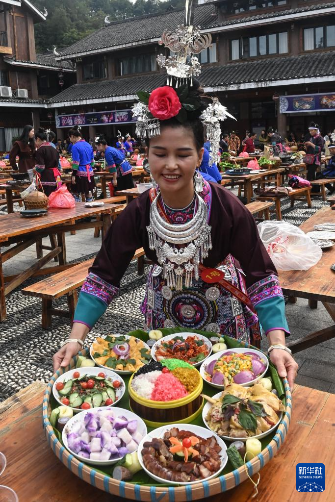 11月9日,在廣西三江侗族自治縣月也侗寨,一名侗族婦女在擺放油茶宴食品。