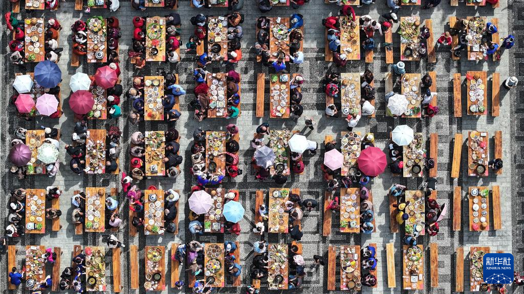 11月9日,廣西三江侗族自治縣的侗族群眾舉辦油茶宴歡迎前來參加多耶節活動的客人(無人機照片)。