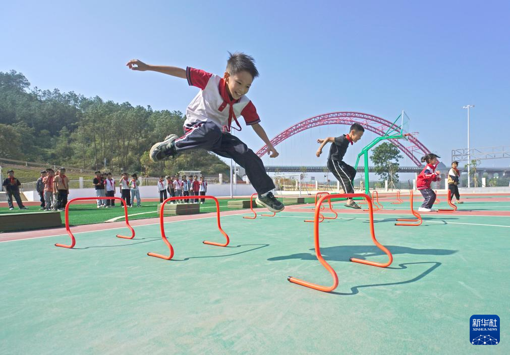 11月7日,孩子們在廣西欽州市靈山縣舊州鎮石橋小學新校區跑步。