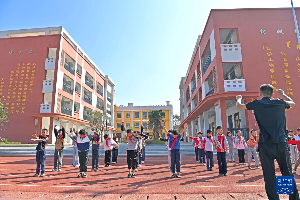 11月7日,孩子們在廣西欽州市靈山縣舊州鎮石橋小學新校區操場上運動。