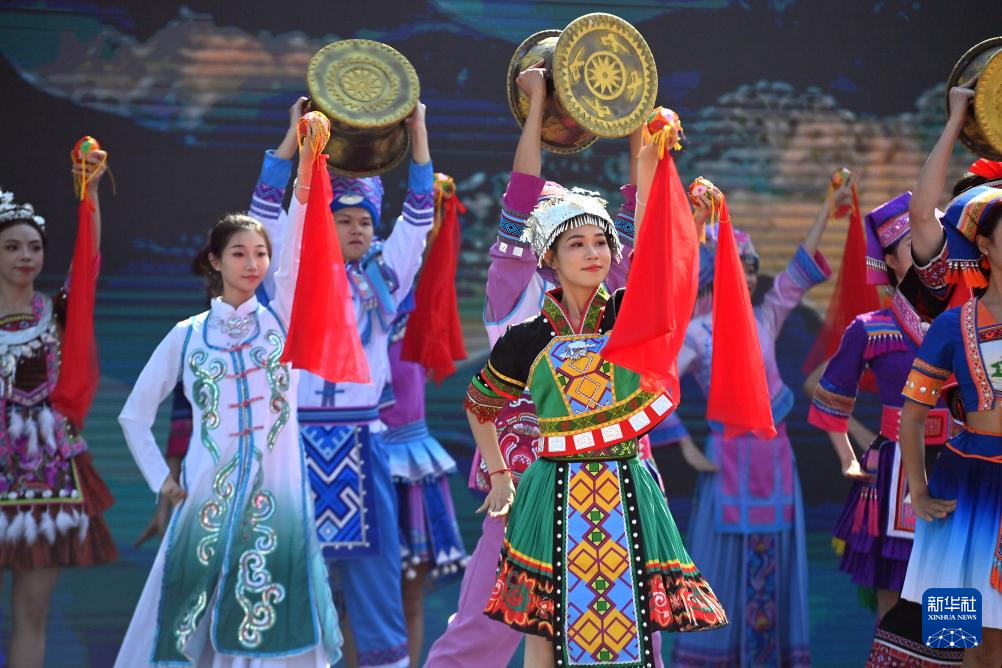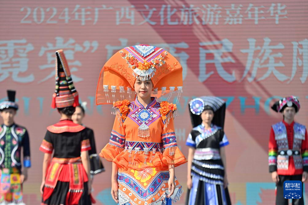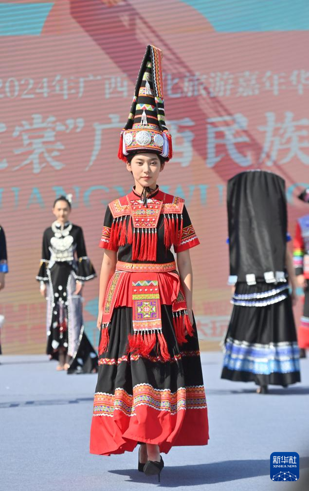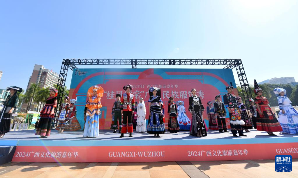 11月12日,在梧州市政廣場,模特在展示民族服飾。