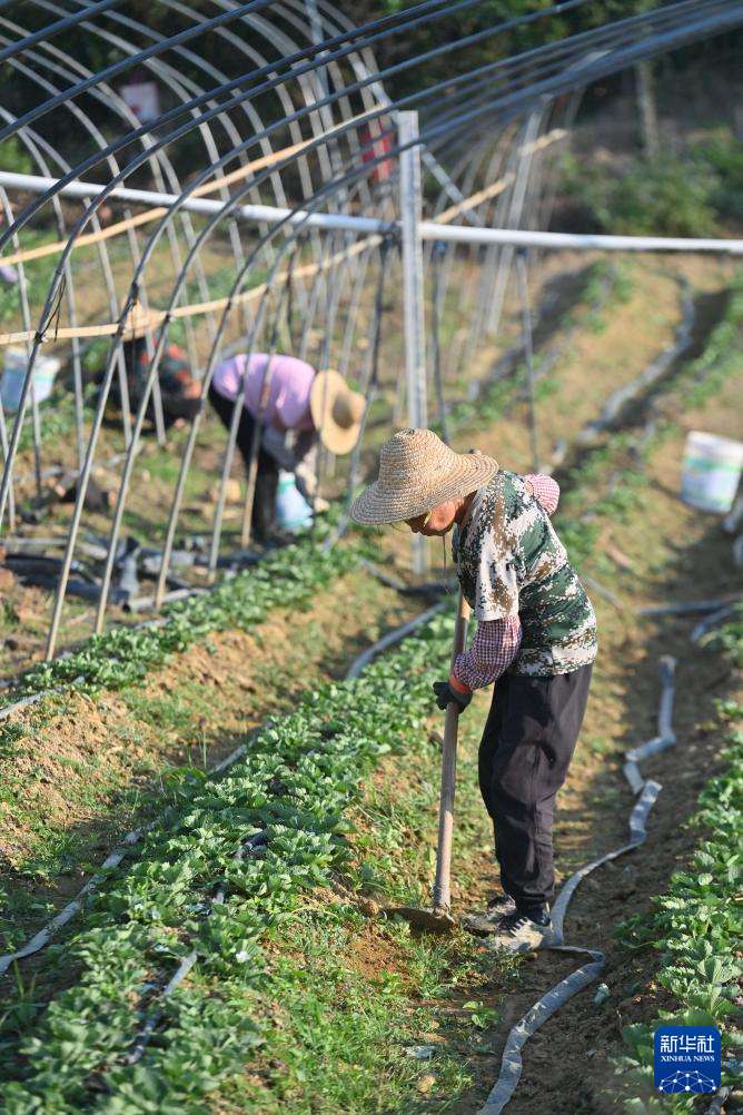 11月13日,在梧州市長洲區倒水鎮富萬村,村民在草莓采摘體驗園種植草莓。