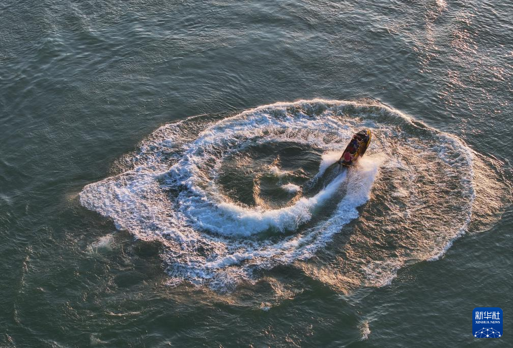 11月13日,在梧州市長洲區長洲鎮泗洲村,游客在西江上體驗摩托艇運動(無人機照片)。