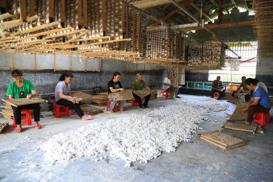 五圩鎮村民在收蠶繭。彭昌伶 攝