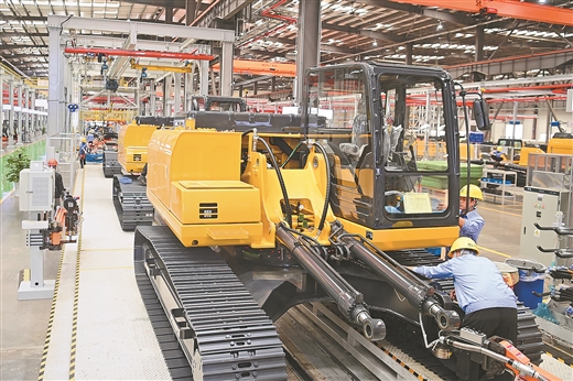 連日來,在柳工挖掘機智慧工廠總裝生產車間,工人們在生產線上忙碌作業,全力沖刺第四季度生產目標。黃蕊/攝