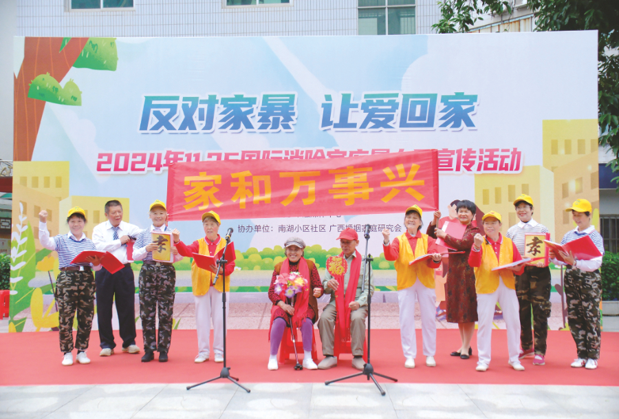 11月24日,由南寧市婦聯主辦的“反對家暴讓愛回家”2024年“11·25”國際消除家庭暴力日宣傳活動走進青秀區南湖小區社區,活動現場不僅有豐富多彩的文藝節目、寓教于樂的趣味游戲,還有巾幗志愿者為居民答疑解惑,進一步提高了廣大婦女群眾和家庭成員對家庭暴力危害的認識,增強反家暴維權意識。