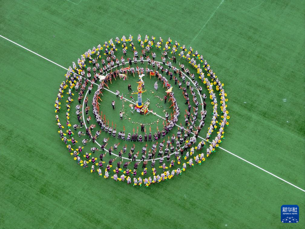 在融水苗族自治縣民族體育公園舉行的蘆笙斗馬節開幕式現場,人們在表演民族歌舞(11月23日攝,無人機照片)。