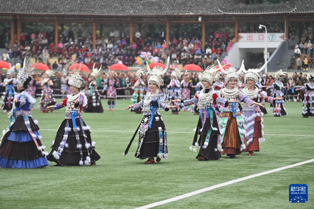 在融水苗族自治縣民族體育公園舉行的蘆笙斗馬節開幕式現場,當地群眾在展示民族文化(11月23日攝)。