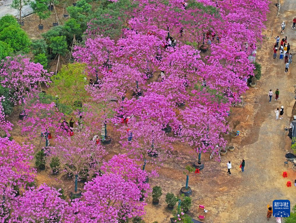 眼下,廣西南寧市三塘鎮十里花卉長廊紫花風鈴木盛放,粉紫色的花朵在冬日里格外艷麗,吸引游客前來觀賞。