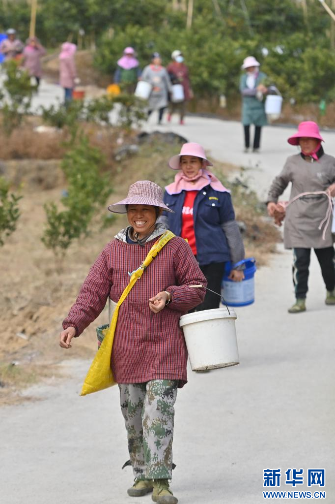 在柳州市柳江區土博鎮水源村,完成采摘工作的婦女們走出金桔園(12月18日攝)。