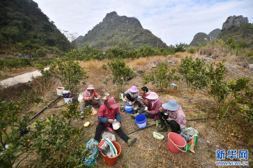 采摘金桔的婦女們在柳州市柳江區土博鎮水源村吃午飯(12月18日攝)。
