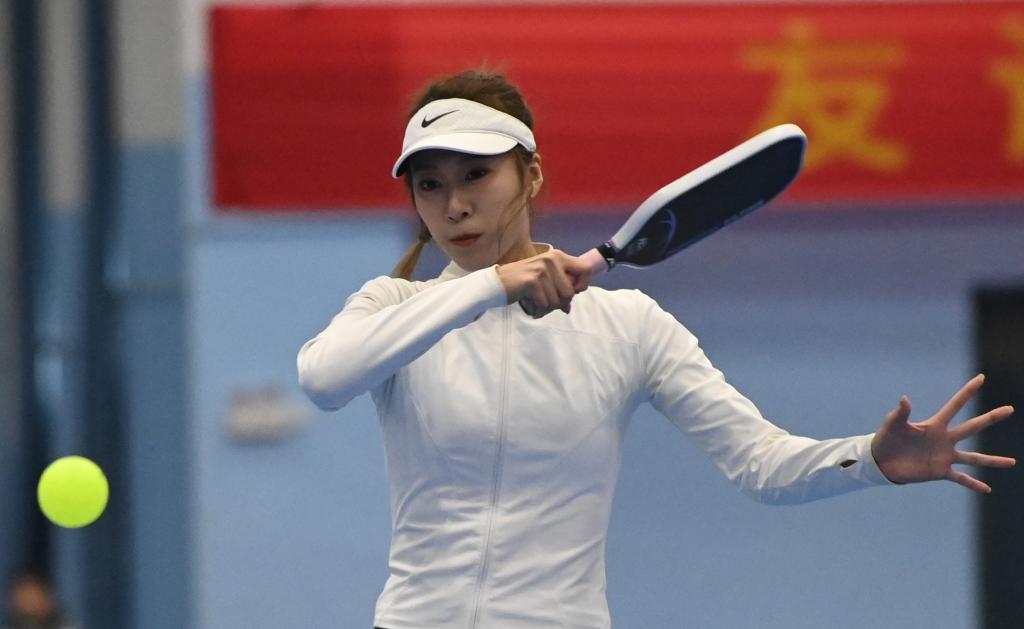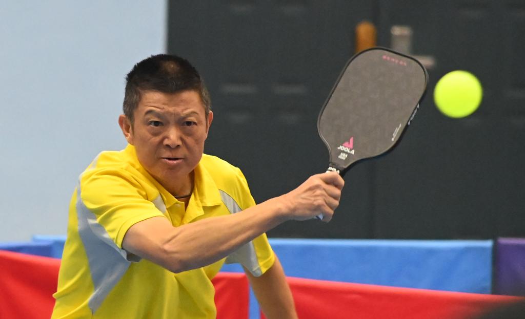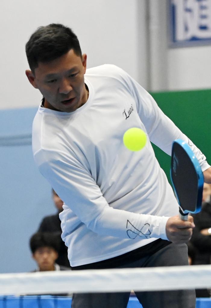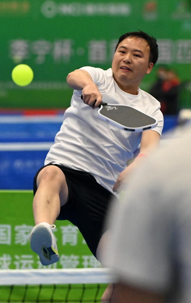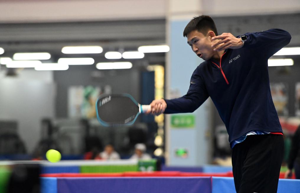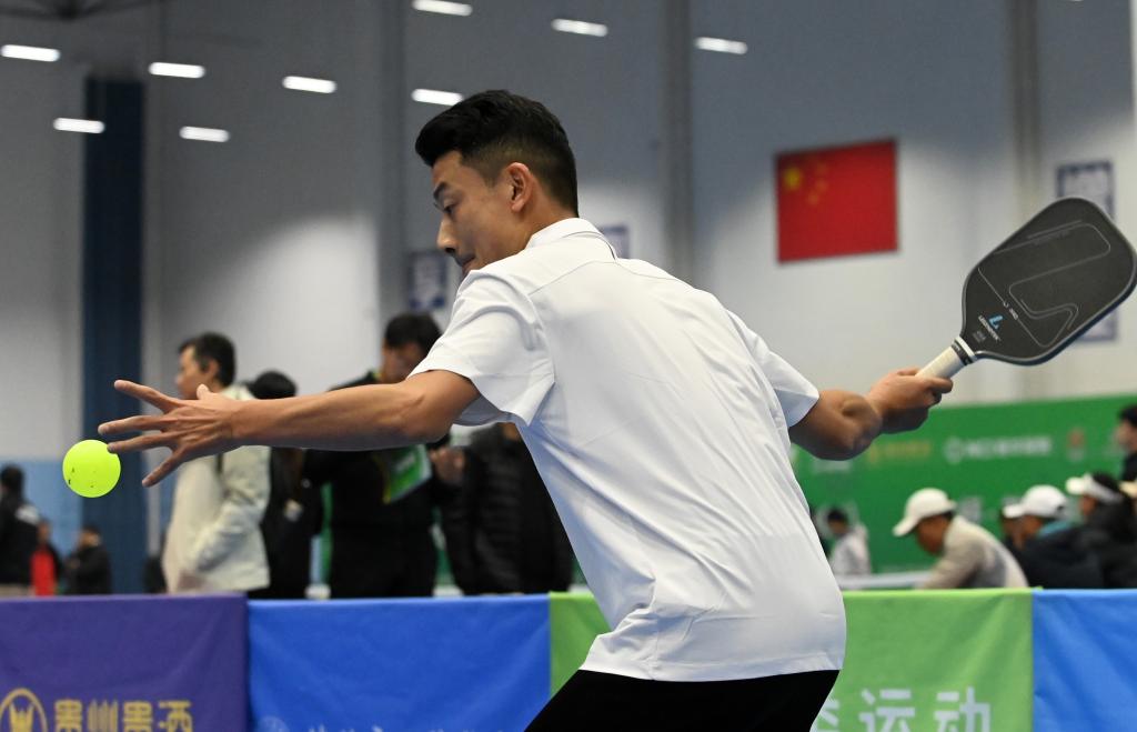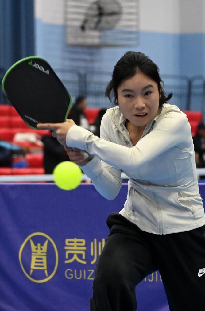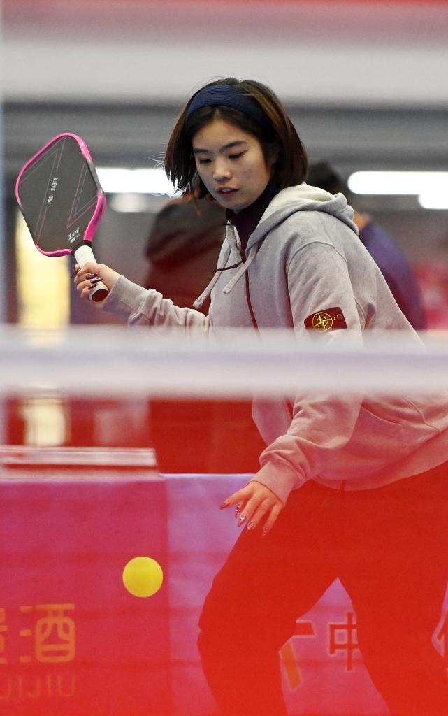 12月21日,在廣西桂林電子科技大學球類館,匹克球賽選手在比賽中。