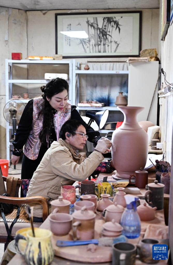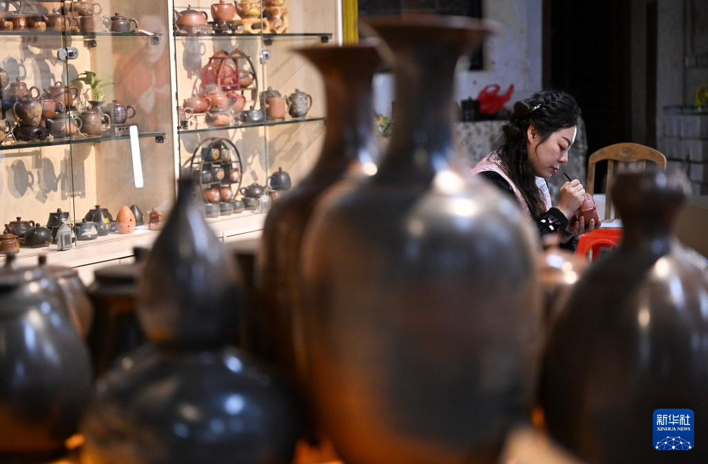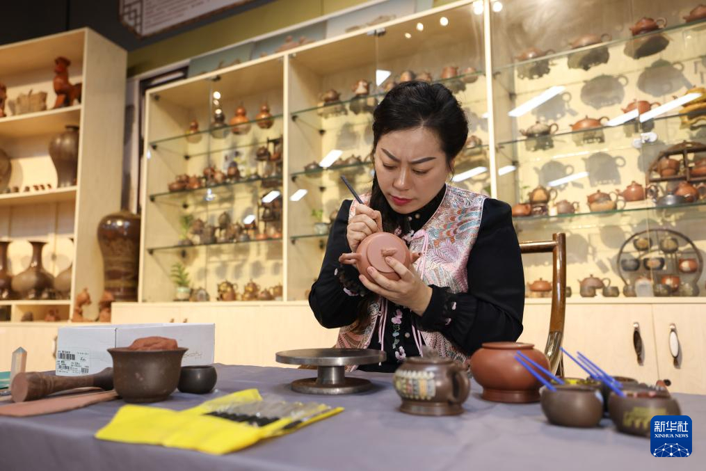 1月2日,郭卉在工作室里為雕刻好的茶壺彩繪。
