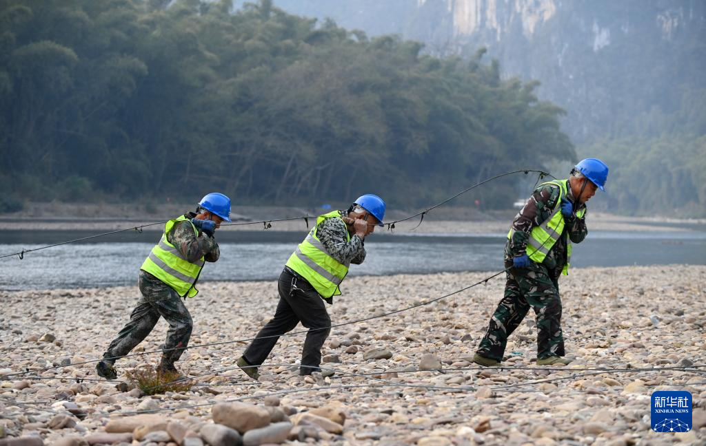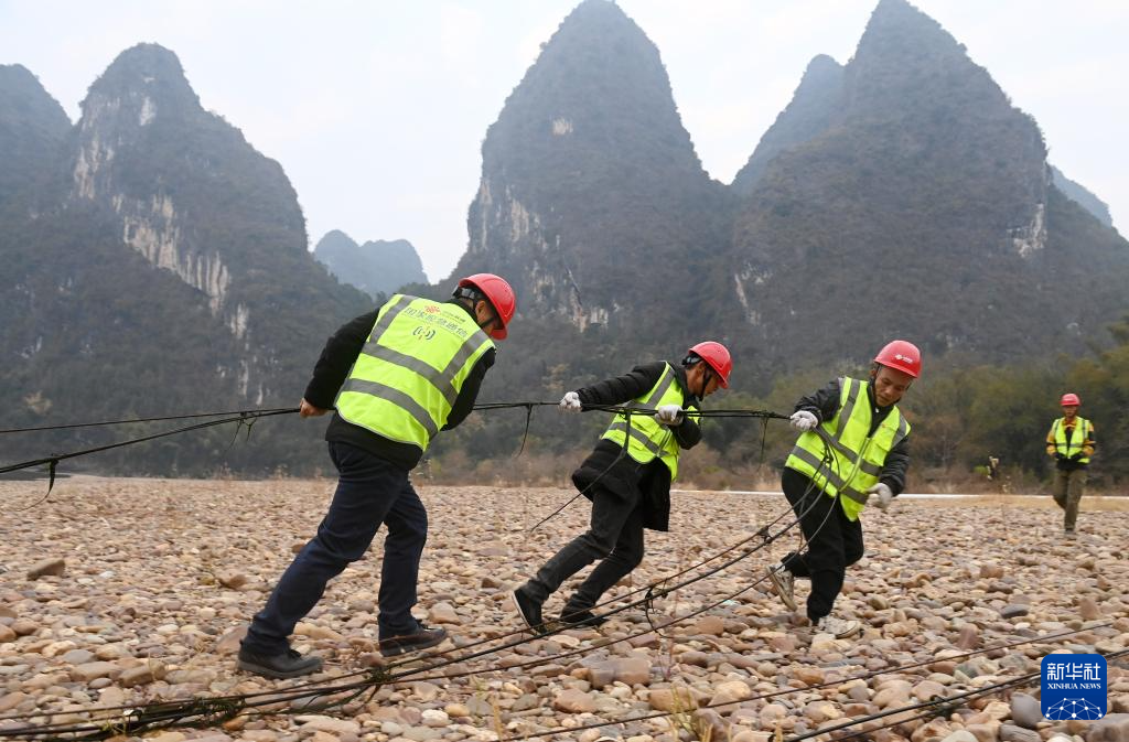 1月8日,工人在漓江邊進行線纜遷改作業。