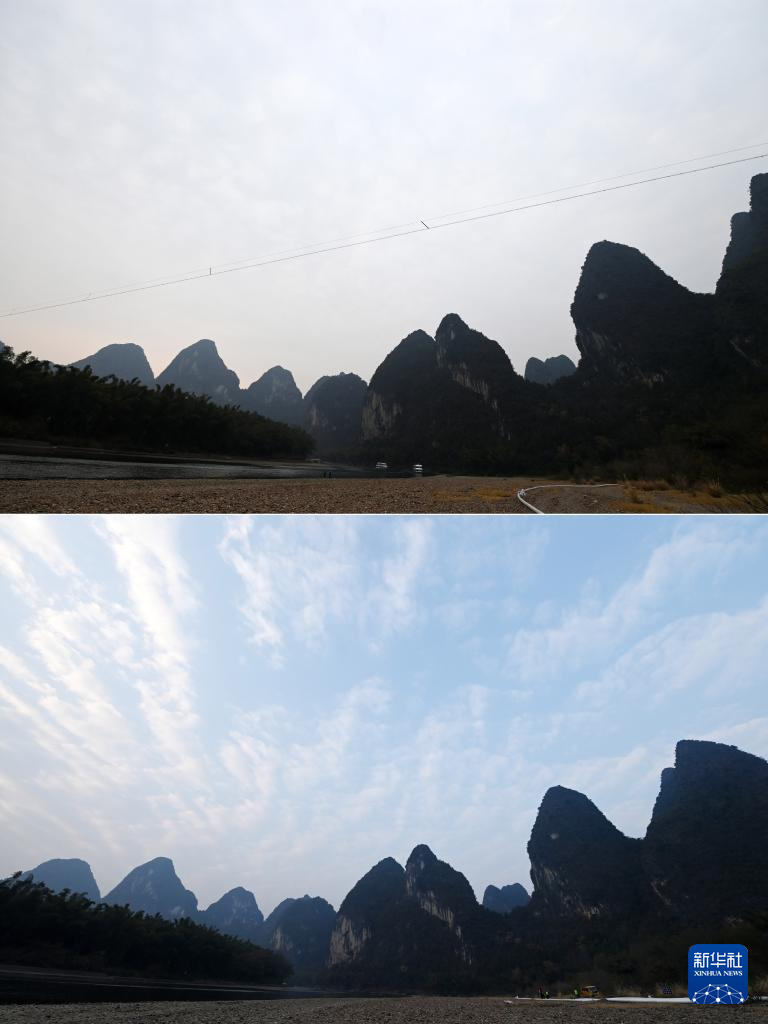 拼版照片,上圖為:線纜遷改前的漓江山水景觀(1月7日攝);下圖為:線纜遷改后的漓江山水景觀(1月8日攝)。