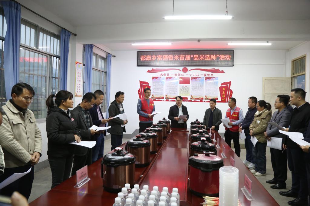 據了解,都康鄉境內天然富硒土壤面積達4萬畝。都康鄉黨委政府立足資源稟賦,充分發揮組織引領作用,黨組織牽頭指導,黨員示范帶動,合作社指導生產和銷售,農戶負責生產。目前富硒水稻單季種植面積達到1.5萬畝,帶動全鄉6835戶農戶增收致富?!敖裉炫e辦這個活動就是為了挑選優質的水稻品種,找出真正好吃的大米,推動都康富硒米產業持續向好發展?!倍伎掂l黨委書記李鋒說。
