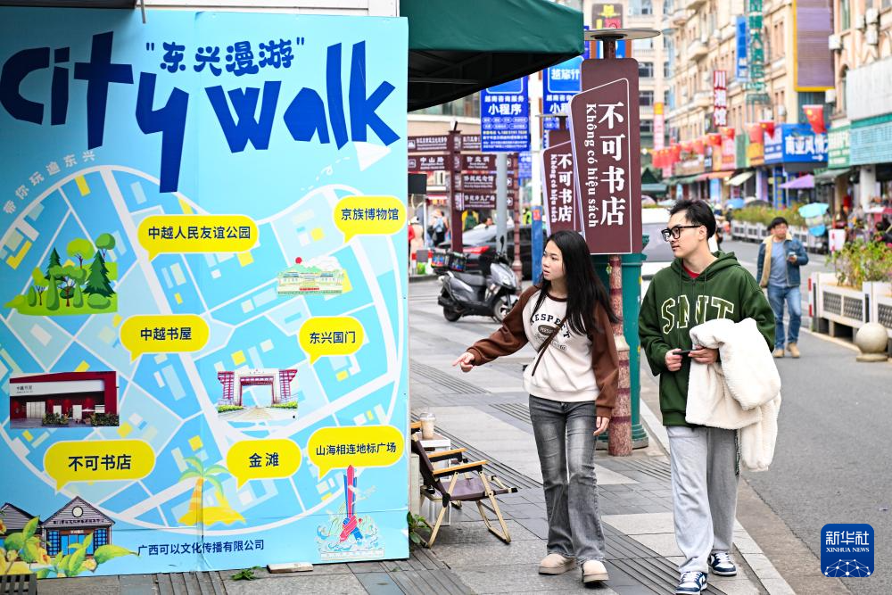 1月8日,路人關注東興街頭“東興漫游”地圖。