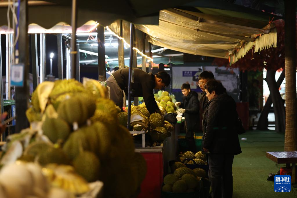 1月8日,游客在廣西東興國門景區步行街內選購榴蓮。