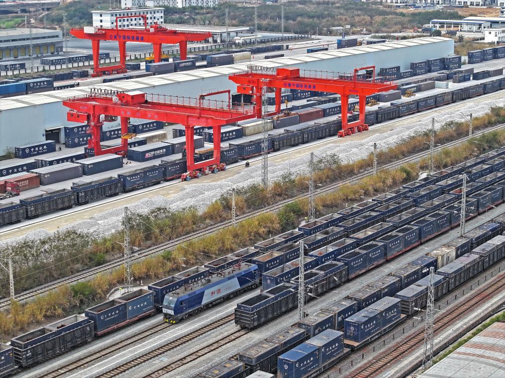 1月10日,列車在南寧國際鐵路港編組(無人機照片)。