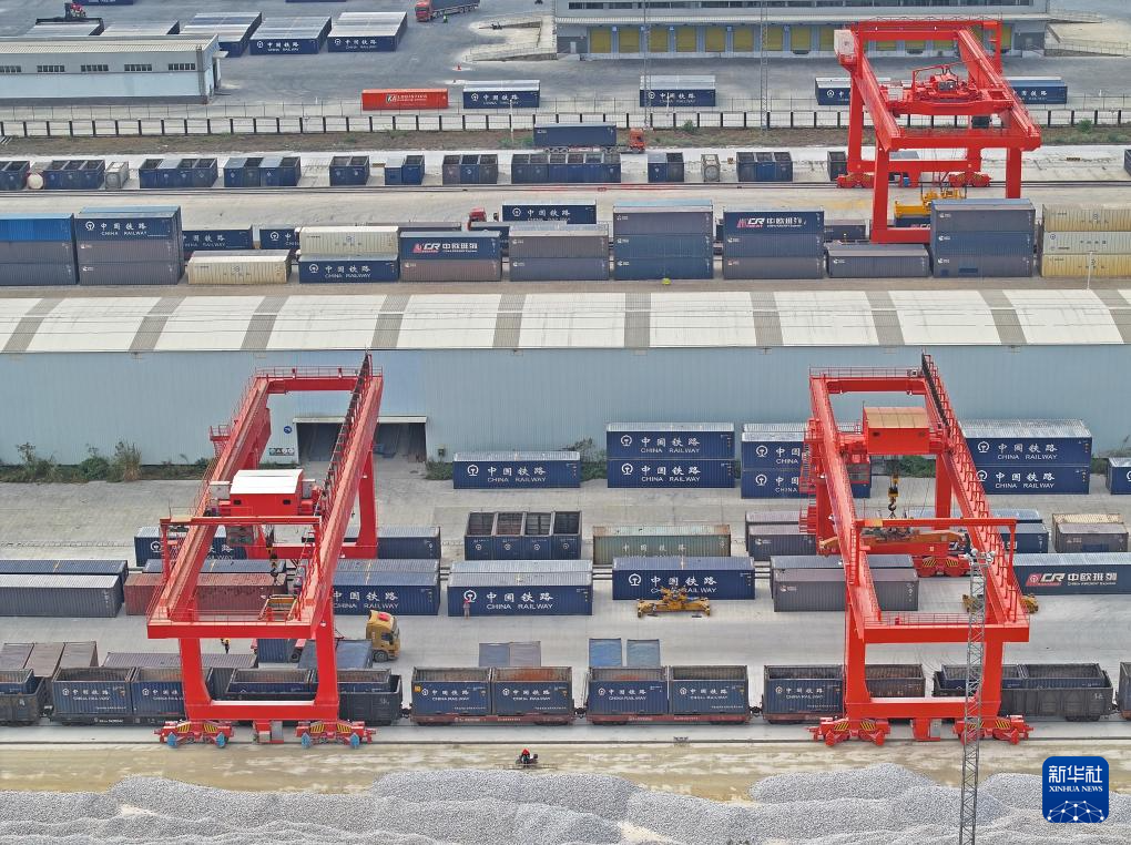 1月10日,起重機在南寧國際鐵路港裝卸集裝箱(無人機照片)。