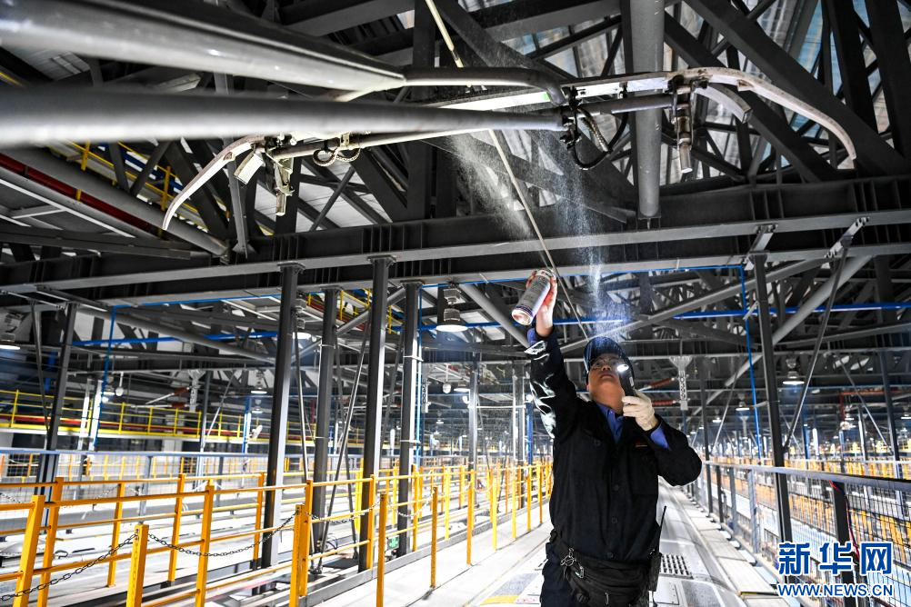 1月14日,在中國鐵路南寧局集團有限公司南寧車輛段南寧動車所,地勤機械師對動車走行部進行檢查。