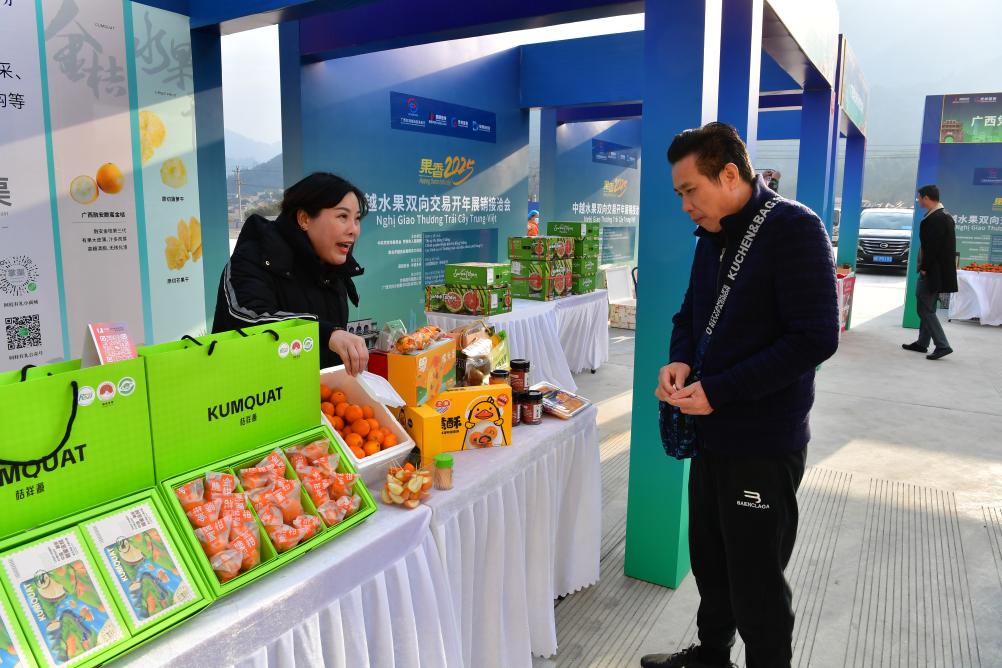 在廣西憑祥舉辦的中越水果“雙向交易”開年展銷接洽會上,客商展示特色農產品(資料照片)。新華社發(憑祥市委宣傳部供圖)