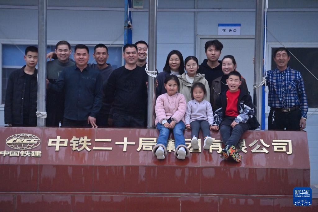 在柳州市柳江區三都鎮魚宜高速公路建設工地,中鐵二十局的工人和家屬合影(1月22日攝)。