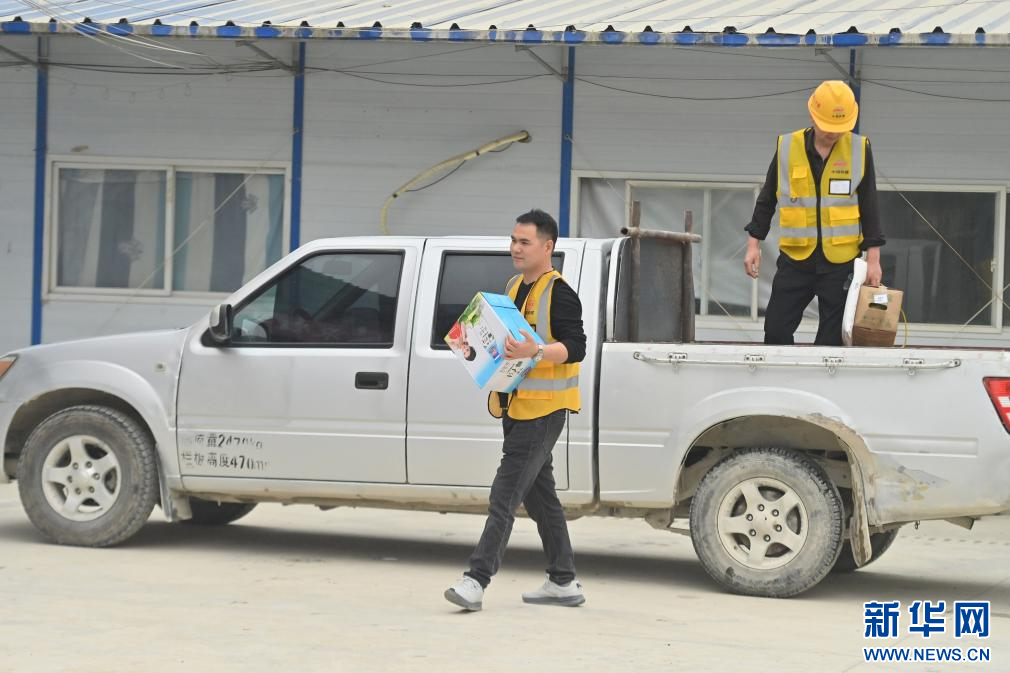 在柳州市柳江區三都鎮魚宜高速公路建設工地,中鐵二十局的工人在搬運年貨(1月23日攝)。