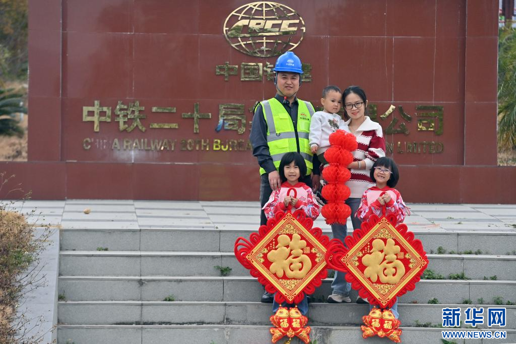 在柳州市柳江區三都鎮魚宜高速公路建設工地,中鐵二十局工人余成奇和來自湖北的妻兒合影(1月24日攝)。