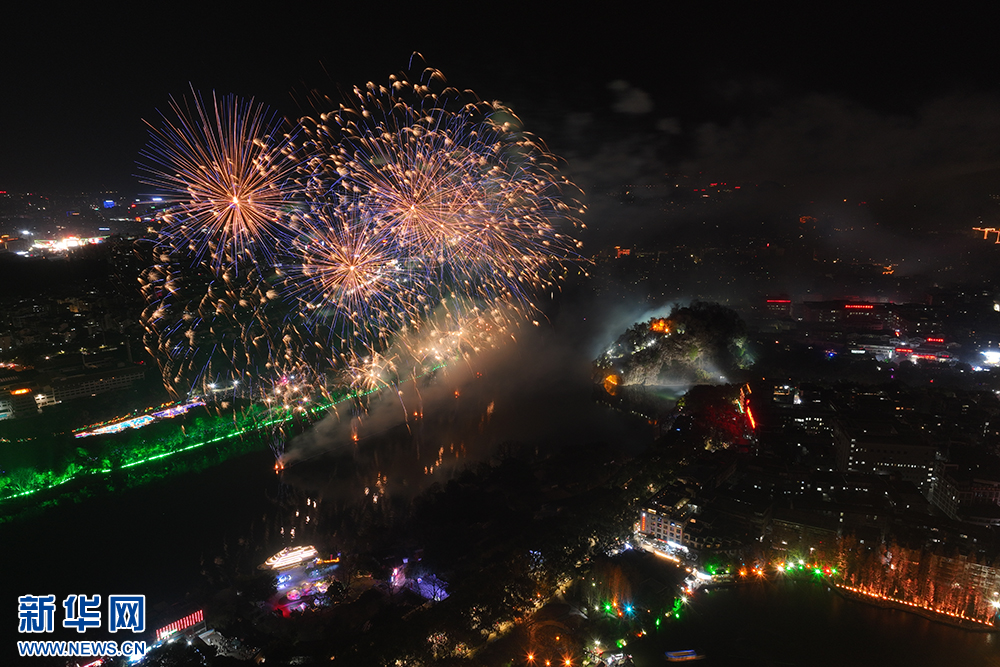 1月29日(大年初一)晚,主題為“焰火迎新春·山水展風華”的焰火秀在桂林舉行。絢麗的焰火點亮夜空,與象鼻山、日月雙塔交相輝映,讓山水甲天下的桂林展現多元魅力。