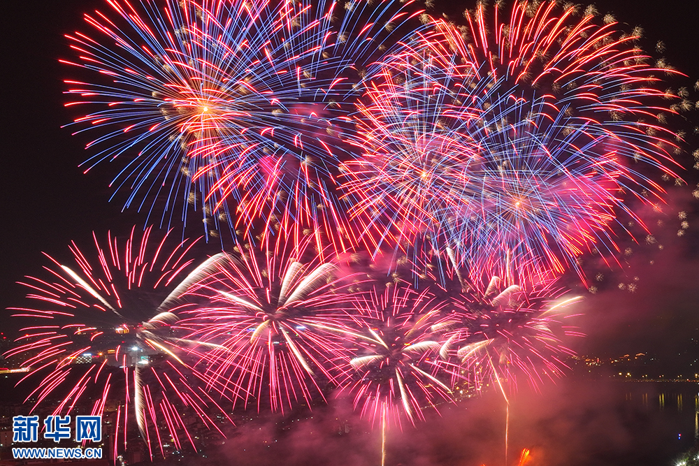圖為無人機拍攝的絢麗的山水焰火秀(新華網發 劉崢 攝)
