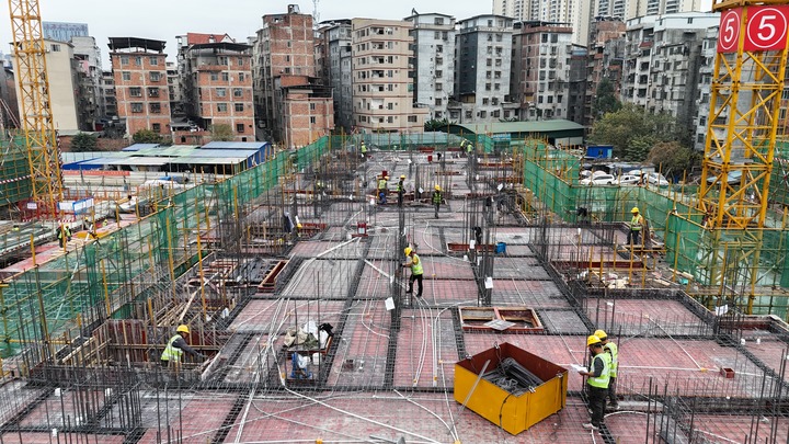 新華社南寧2月6日電(記者黃浩銘)在廣西南寧市雞村城中村改造項目現場,工人正在進行地面主體二層施工,吊機將鋼筋吊裝運輸到各個施工點位,混凝土泵機在進行混凝土澆筑工作,施工現場一片繁忙。為搶抓工期,確?;剡w居民能早日住上新房,春節期間施工現場有近百名工人堅守工作崗位。