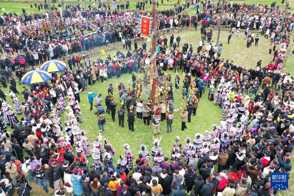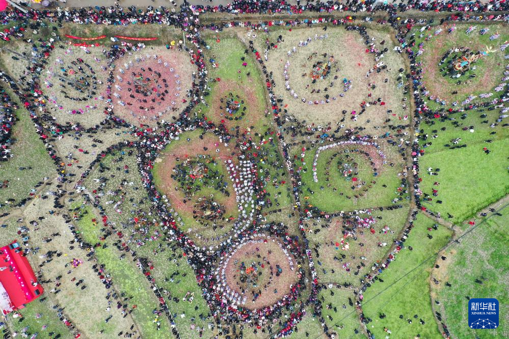2月10日,在柳州市融水苗族自治縣安太鄉“十三坡會”上,各族群眾共跳蘆笙踩堂舞(無人機照片)。
