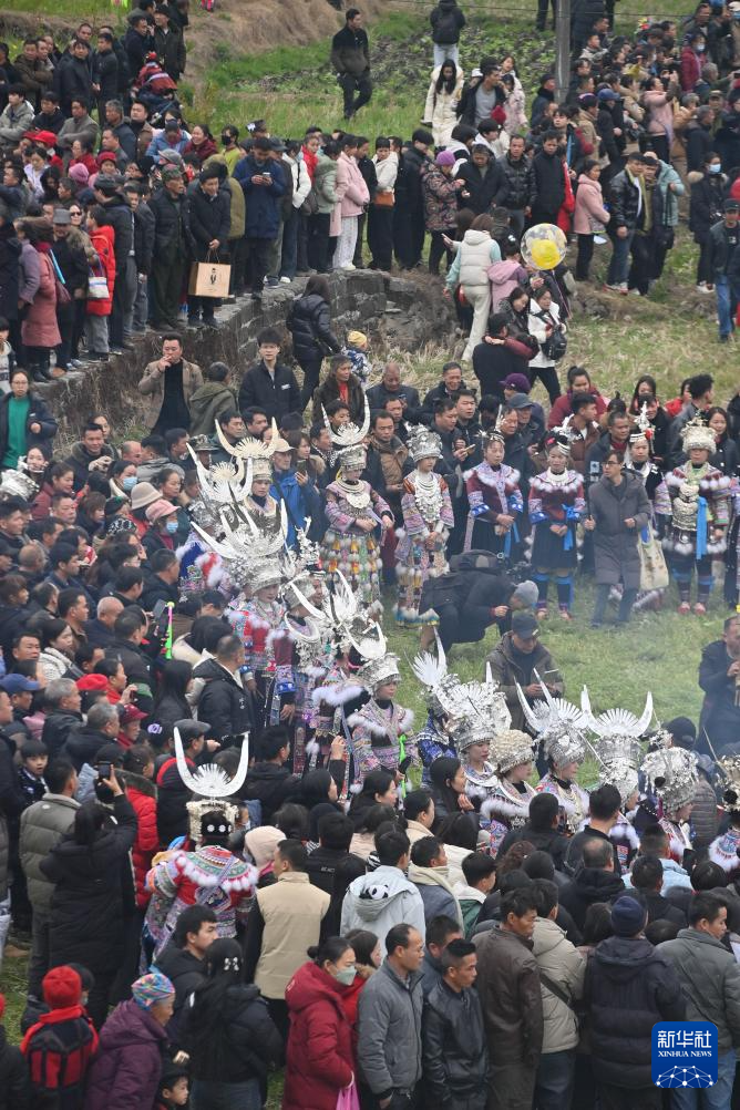 當日是農歷正月十三,廣西柳州市融水苗族自治縣安太鄉迎來一年一度的“十三坡會”。當地各族群眾歡聚一堂,開展吹蘆笙、跳踩堂舞等活動。