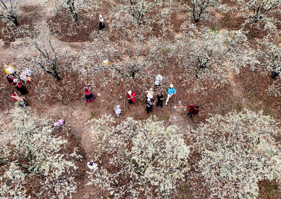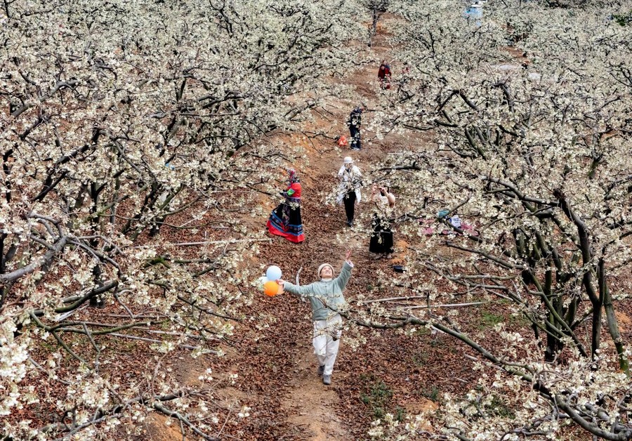 近日,在廣西賀州市八步區蓮塘鎮美儀村,連片的山楂花競相綻放,潔白如雪的花瓣鋪滿枝頭,美不勝收。市民游客紛至沓來,漫步在花海間,感受早春氣息。圖為游客在賞花拍照。黎豪圖/攝