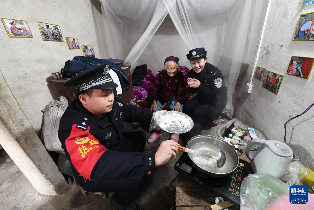 2023年2月5日,在廣西賓陽縣黎塘鎮梁村,賓陽站派出所民警給黃愛明老人煮湯圓。新華社記者 陸波岸 攝