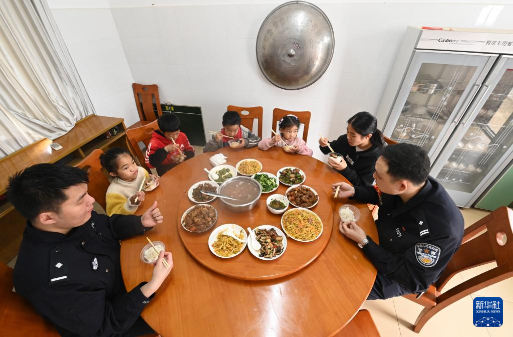 2月12日,在南寧鐵路公安局南寧公安處賓陽站派出所,民警和張何花5姐弟吃團圓飯。新華社記者 陸波岸 攝