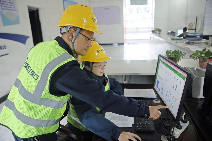 貴港碼頭散貨作業區貨管隊長阮立斌與同事研究堆場計劃方案。黃瑩瑩 攝