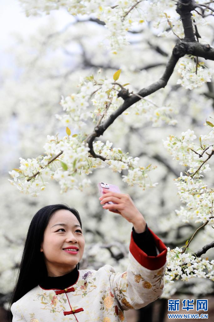 2月15日,在廣西賀州市八步區蓮塘鎮美儀村,游客在山楂樹下賞花拍照。
