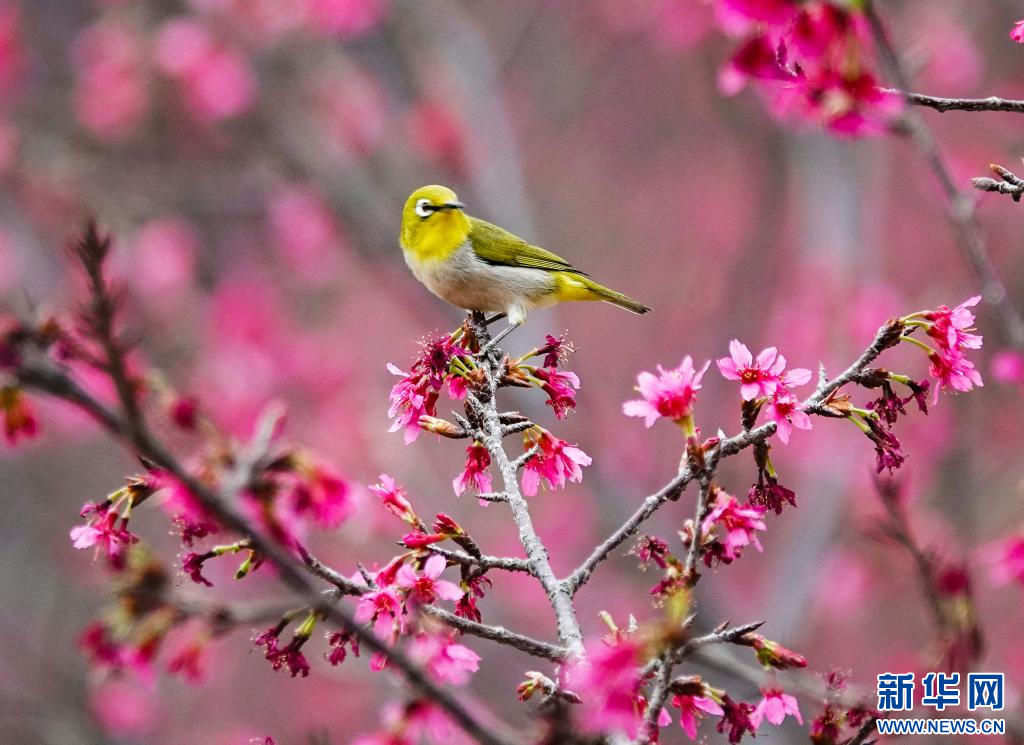 2月14日,在廣西南寧市青秀山景區櫻花園,一只小鳥立在櫻花枝頭。