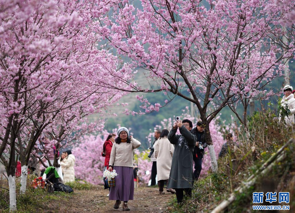 2月19日,游客在廣西靈川縣三街鎮普賢村富丘生態園賞花游玩。