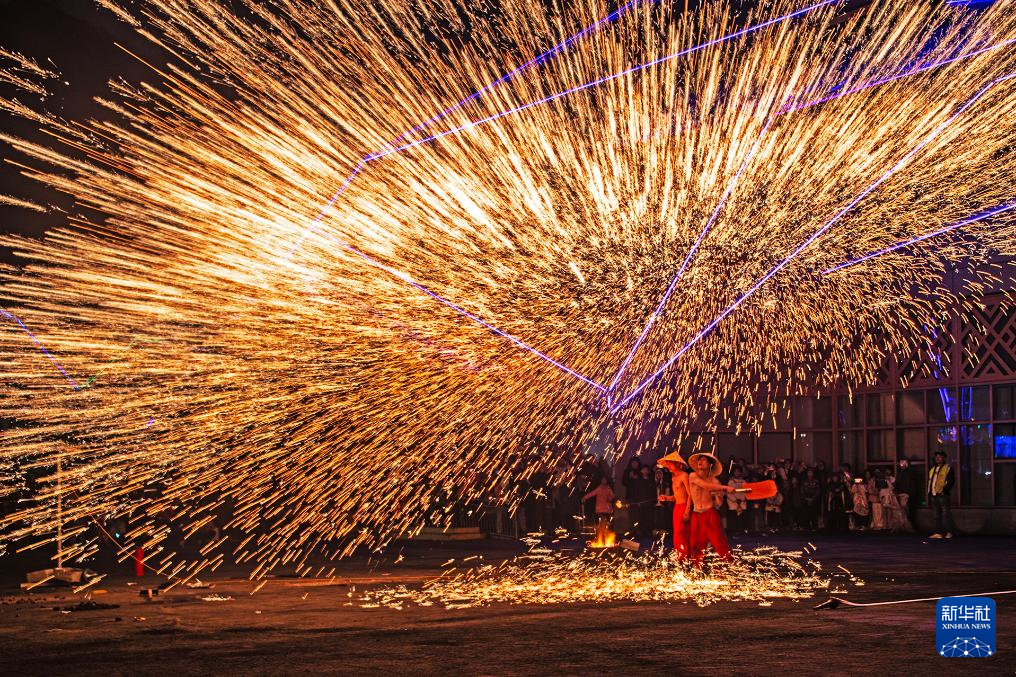 2月12日,農歷正月十五元宵節,民間藝人在廣西壯族自治區靖西市進行非遺“打鐵花”表演。