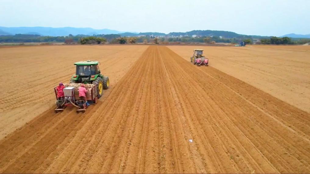 2月19日,在廣西來賓市興賓區鳳凰鎮國家現代農業產業園黃安優質“雙高”糖料蔗基地,七臺大型拖拉機、甘蔗種植機并列同步作業,蔗農有條不紊地往入口糟插入蔗苗,機器自動完成植苗、蓋膜、覆土工作,不到15分鐘,兩壟長約200米的甘蔗全部種植完畢。