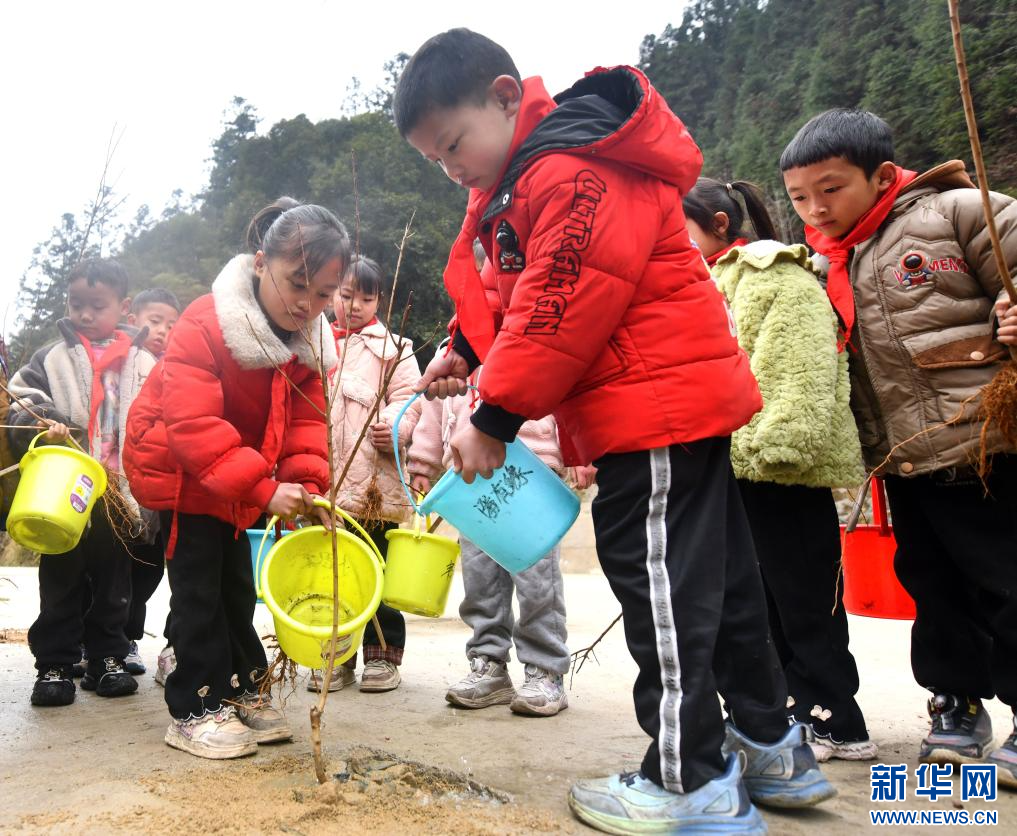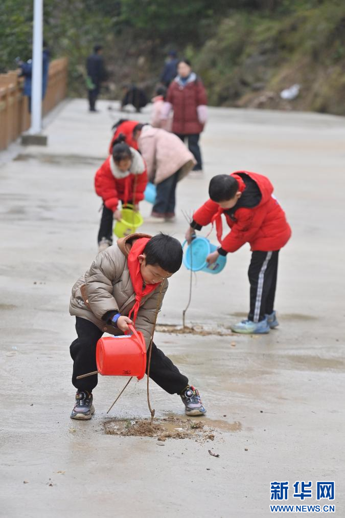 2月26日,在融水苗族自治縣桿洞鄉黨鳩村,參加植樹活動的小學生給樹苗澆水。