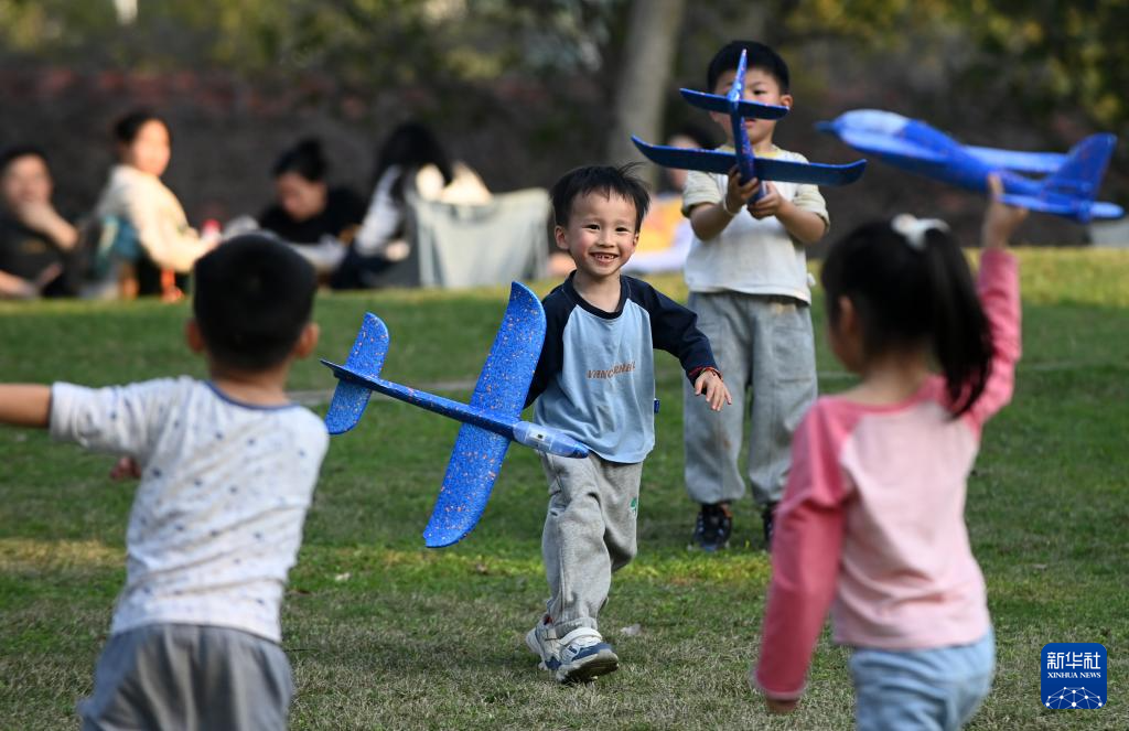 3月2日,小朋友在廣西南寧市南湖邊玩耍。